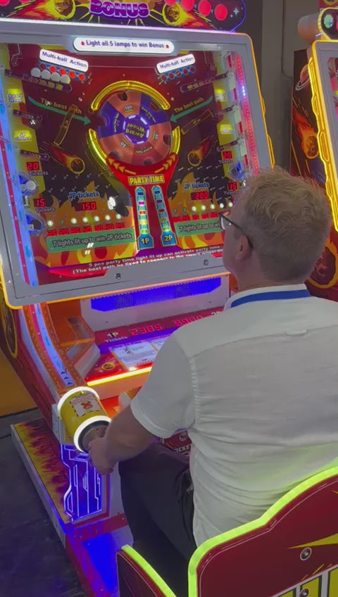 Positions 1 & 2 are a prefixed ticket win. Position 3 drops the ball through a series of pins into one of seven ticket winning positions, successfully illuminating all seven positions awards the lower jackpot. Position 4 gives the chance to and the ball into the award wheel and position 5 accumulates balls for the chance of multi ball feature. Extra features like Party Time and Bonus lights allow the player the chance of large ticket awards.